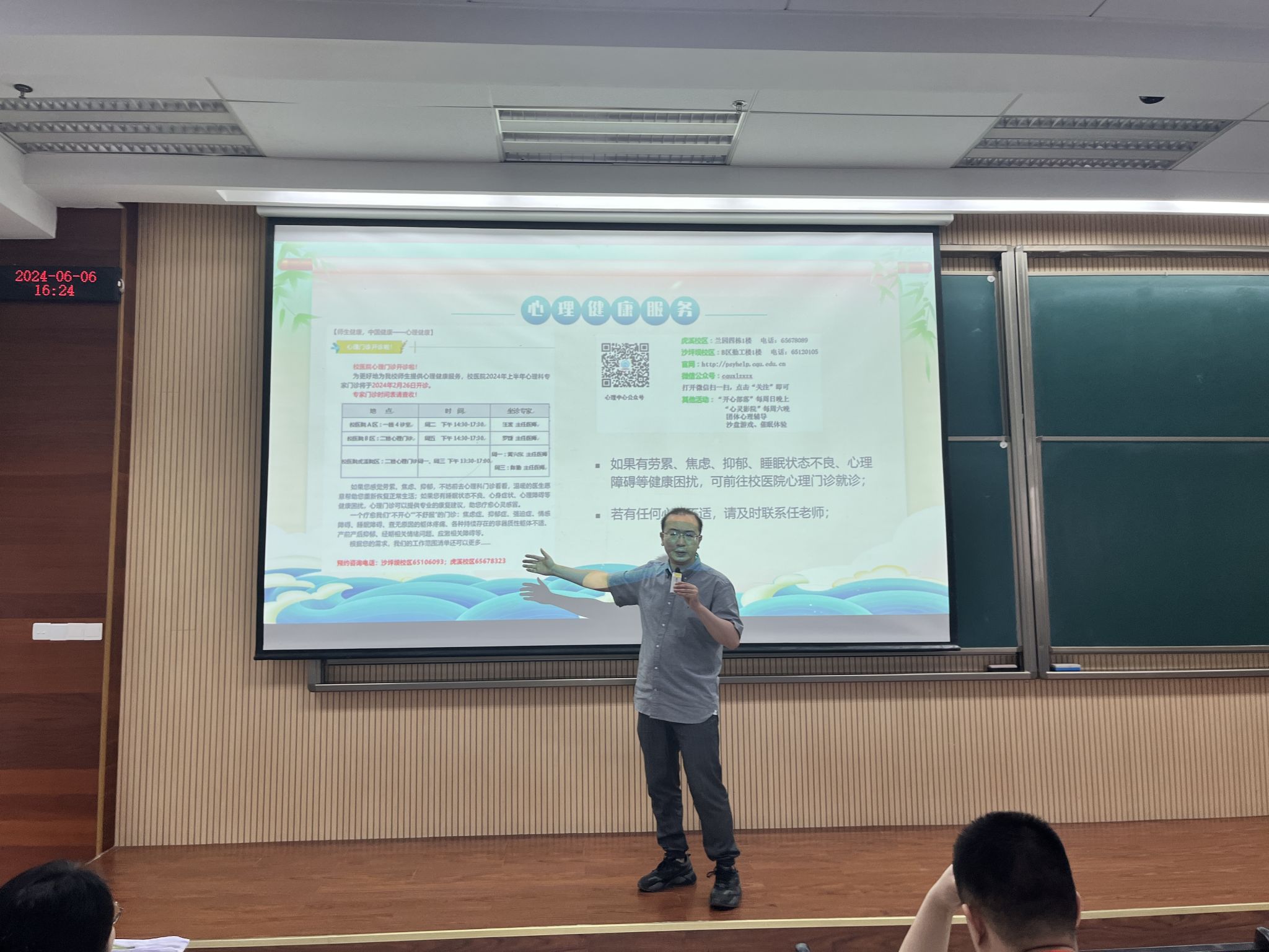 任超老师提醒同学们期末考试将近,及时温习功课,做好复习,方能在考场上游刃有余,从容淡定;他谈到复习中若遇到问题要及时向身边同学、学业助理和任课老师请教。他着重强调了诚信考试,严禁考试作弊。随后,任超老师一一向同学们介绍了学校现有的心理帮扶资源,他表示同学们应客观正确面对心理问题,若存在相关问题,请及时告知辅导员,辅导员协助积极问诊就医。