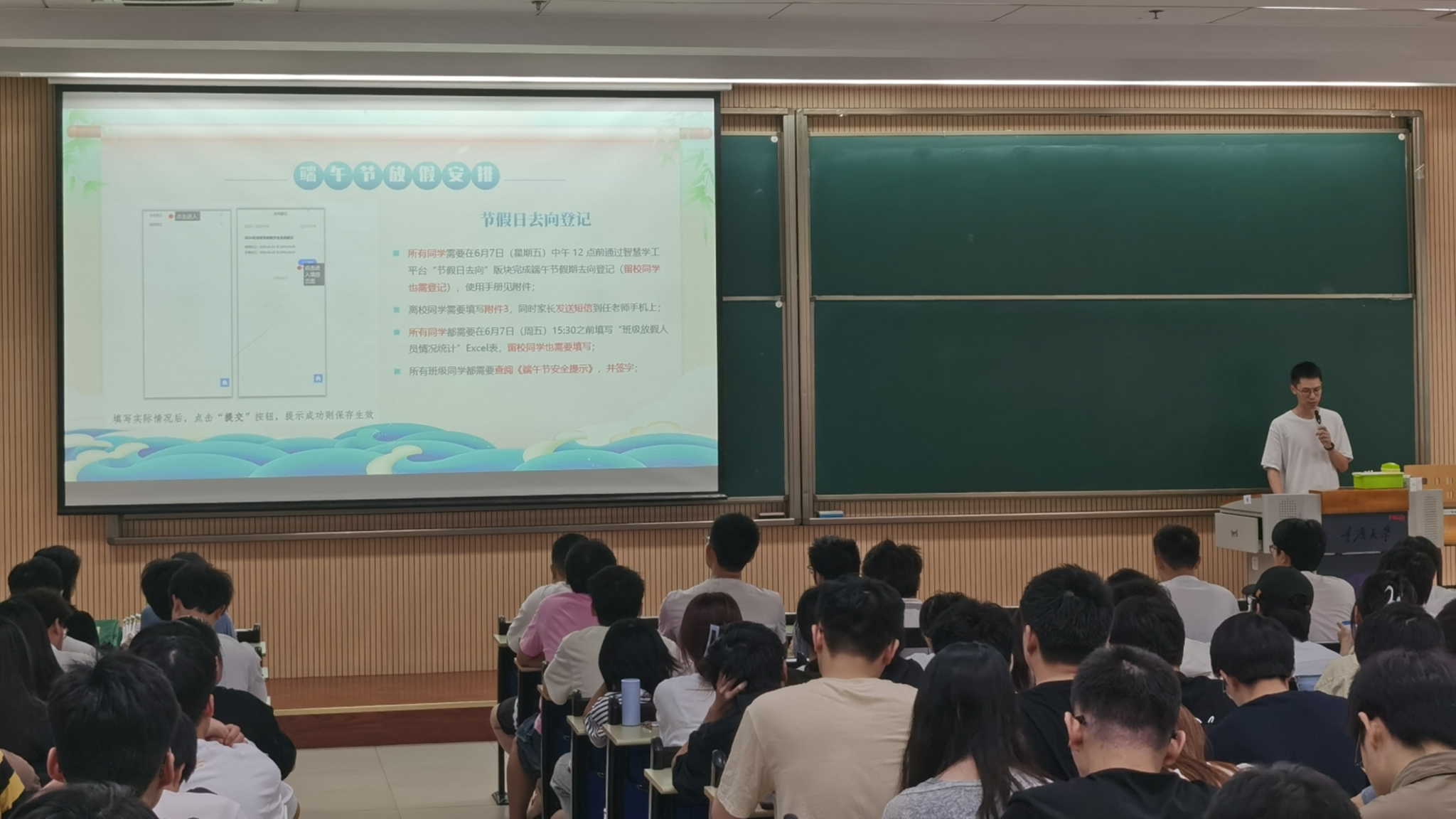 会议伊始,杨灵向大家讲解了即将到来的端午节放假安排。他提醒同学们离校需要按照要求履行相关手续,并向辅导员和班长报备节假日去向。同时,他也强调了端午放假的安全注意事项,从防溺水、防火灾、防触电、防诈骗、交通安全、寝室安全、文明上网等多个方面提醒同学们做好自我安全管理工作。