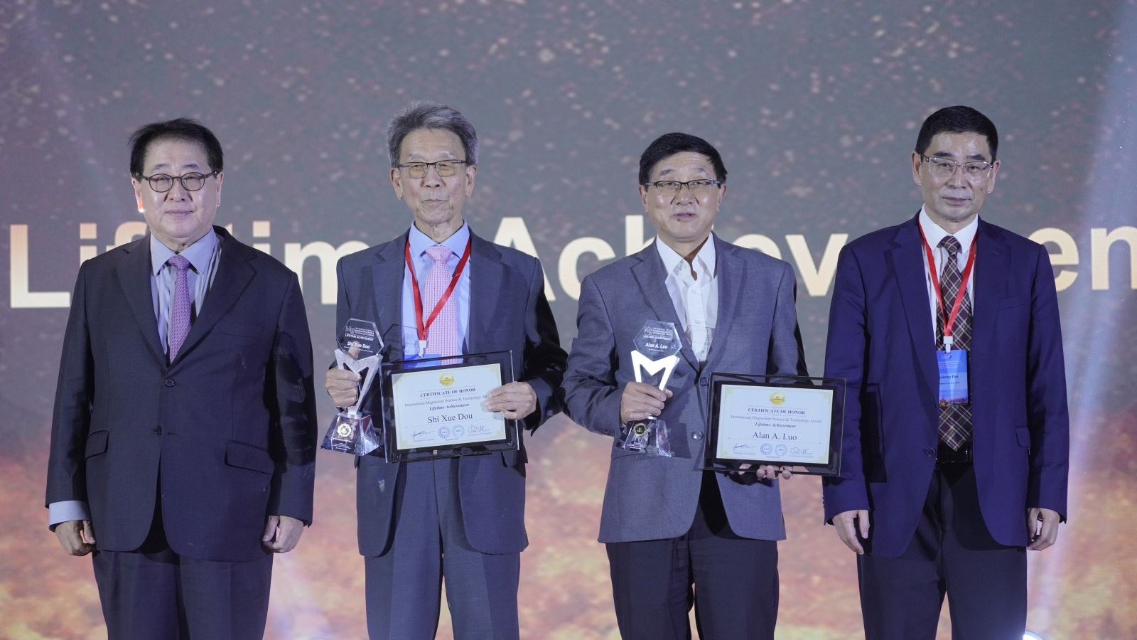 潘复生院士和Kwang Seon Shin院士为终身成就奖获得者Shixue Dou院士和Alan Luo院士颁奖
