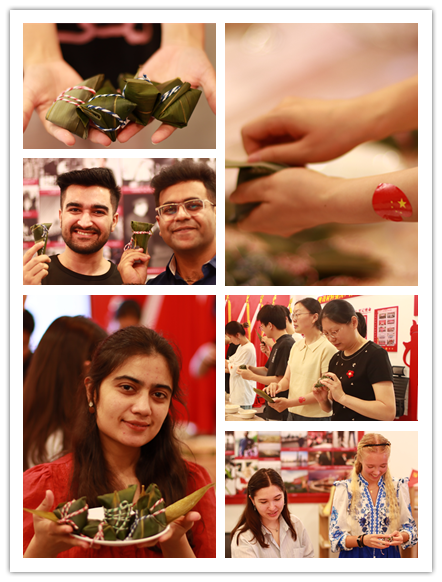 在动手实践环节,中外学子共同参与包粽子活动。师傅耐心演示粽叶折叠、糯米填充、捆扎成型的过程,支部成员和职工们积极动手,现场气氛热烈,中外员工在实践中深入体验端午民俗的魅力。