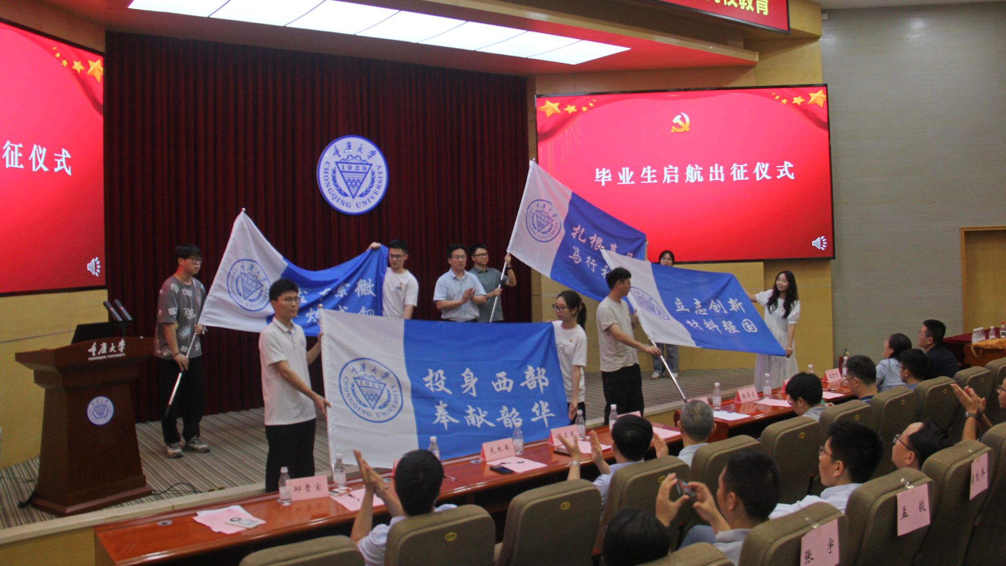 党课结束后,举行毕业生党员启航出征仪式。王敬丰向赴西部地区、基层单位、行业重点单位就业以及升学深造的毕业生党员代表授旗,陈先华为毕业生党员代表赠书。