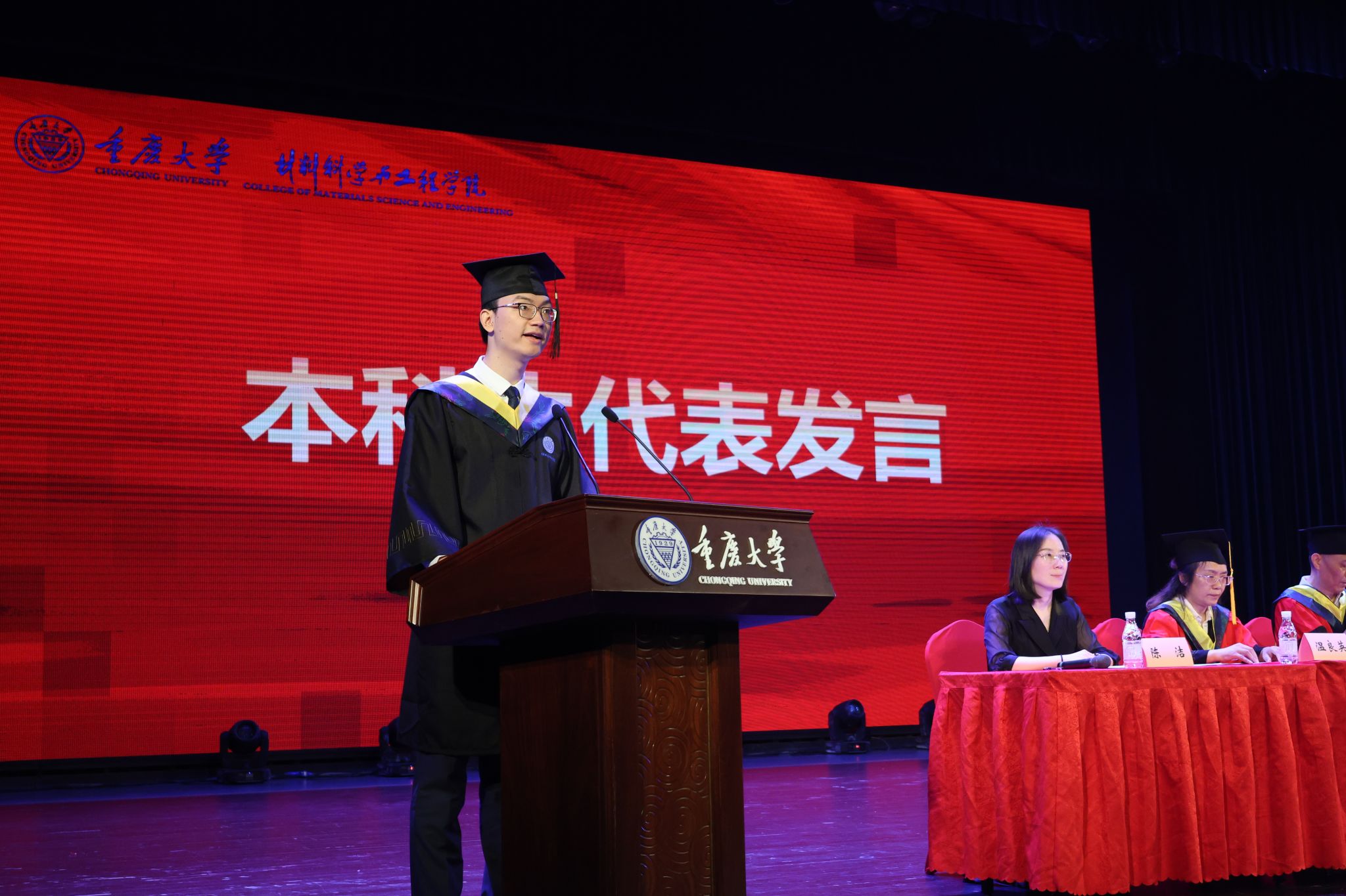 本科毕业生代表王灿回顾成长历程,向学院领导、导师和辅导员表达了诚挚谢意,感念学院培养助其从迷茫到坚定,经尝试奋斗收获知识与方向,承诺践行"材料强国 誓作前锋"精神,担当材料人责任,祝同窗前程似锦,学院再创辉煌。