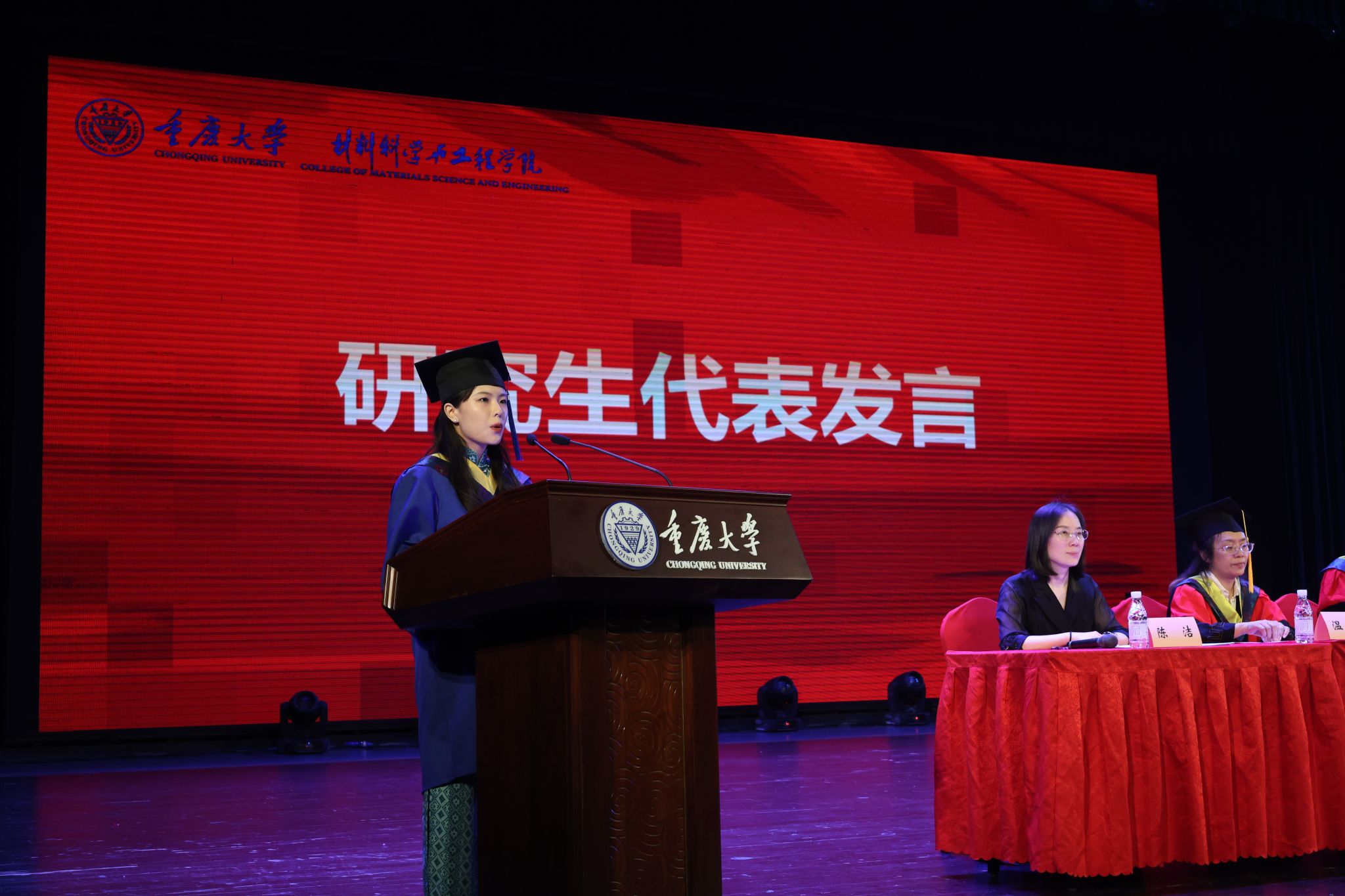 硕士毕业生代表柳月浩感言:学院高水平学术平台与导师悉心指导,提升科研能力、开拓学术视野,为未来奠基;虽奔赴不同领域,仍铭记"材料强国,誓作前锋"使命,重大培育的坚韧品格将成为战胜困难的精神力量。她代表全体毕业生向学院和老师致谢。