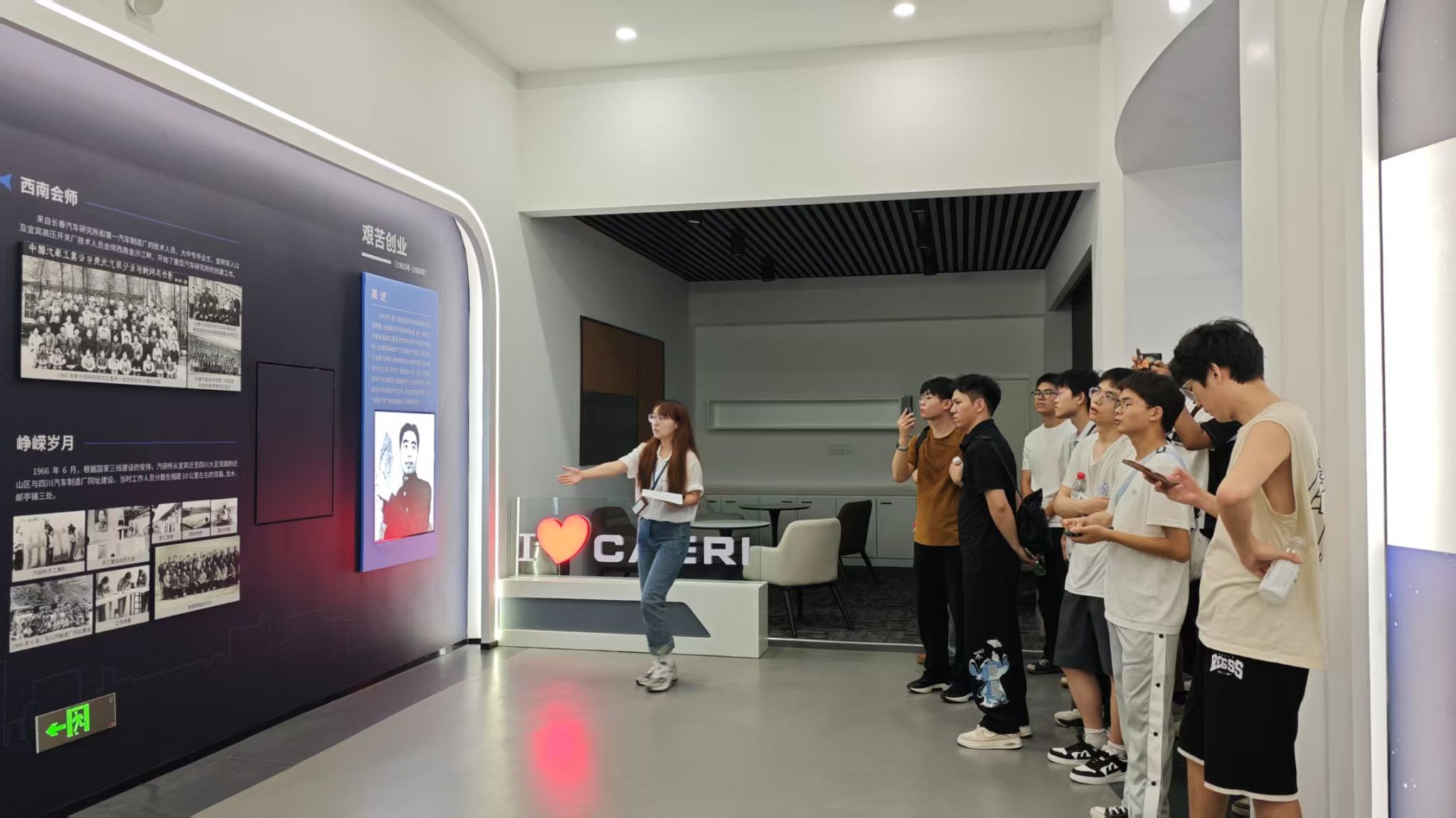 首站是中国汽研展厅。讲解人员向师生介绍了中国汽研从承担我国第一代重型军用汽车研发,到主导斯太尔、五十铃等重大技术引进国产化,再到构建“安全、绿色、体验”三大技术领域的战略转型的发展沿革,完整呈现了企业概况,重点向师生一行展示了企业覆盖全国的9个国家级平台布局等核心创新载体。