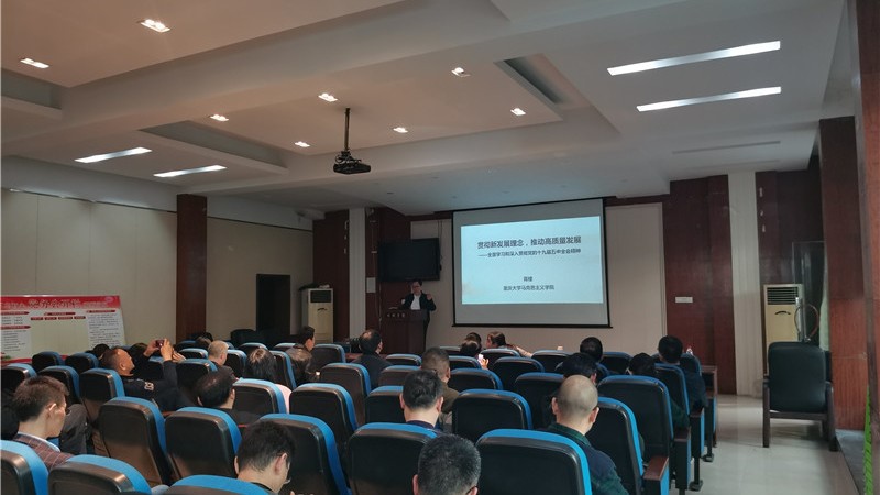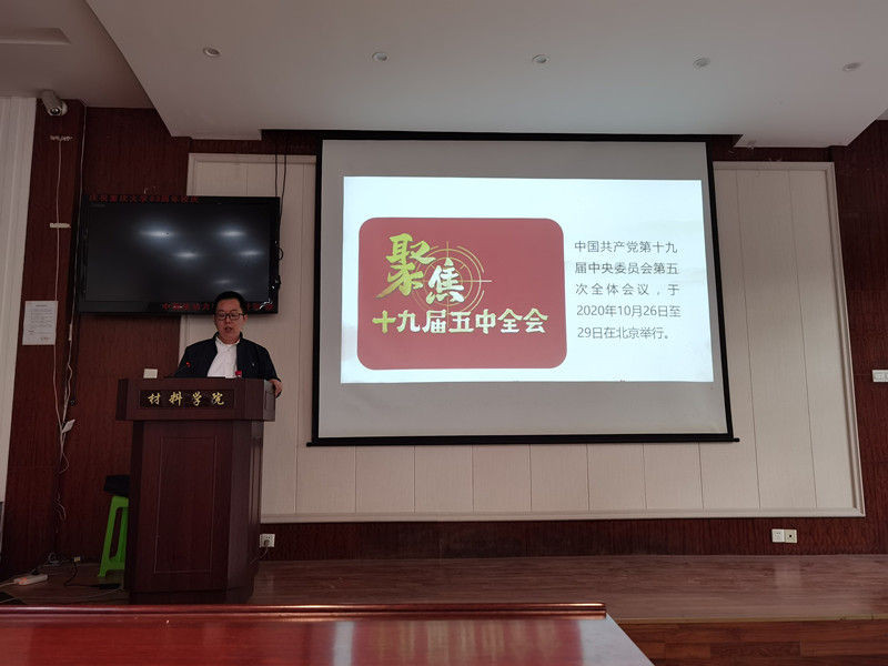20201119日下午,好博体育行政支部、成型系教工支部和建材装饰系教工支部等三个支部,联合开展专题党课活动,邀请马克思主义学院蒋楼老师主讲,专题党课主题为:贯彻新发展理念,推动高质量发展----全面学习和深入贯彻党的十九届五中全会精神。
