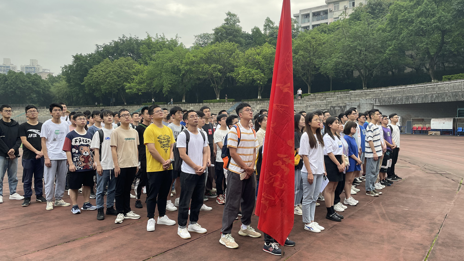 5月31日,学院以党支部为单位,组织150余名员工在A区思群广场参加升旗仪式。早上7:30,在雄壮嘹亮的国歌声中,鲜艳的五星红旗冉冉升起,全体师生行注目礼、高唱国歌,满怀深情向国旗致以最崇高的敬意。升旗仪式之后,员工代表们在国旗之下朗诵了经典爱国诗篇《红旗颂》。“风一路,雨一程......收获一个民族振兴的期盼”。同学们铿锵有力的朗诵,让大家感受到了新中国成立之不易,国家振兴之不易!
