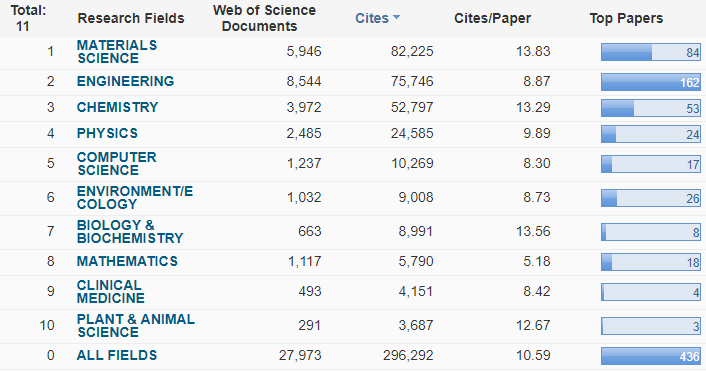 ESI数据库根据论文总被引频次对全球各机构进行排名,根据此次统计数据显示,全球共有6745个机构上榜,好博体育总排名位于572位,比上次数据更新进步8位。在全球入围ESI材料科学学科前1%的961个机构中,公司排名92位,材料科学成为好博体育继工程学后又一个进入ESI全球前1‰学科,这一指标的突破反映了好博体育材料科学的发展持续向好。