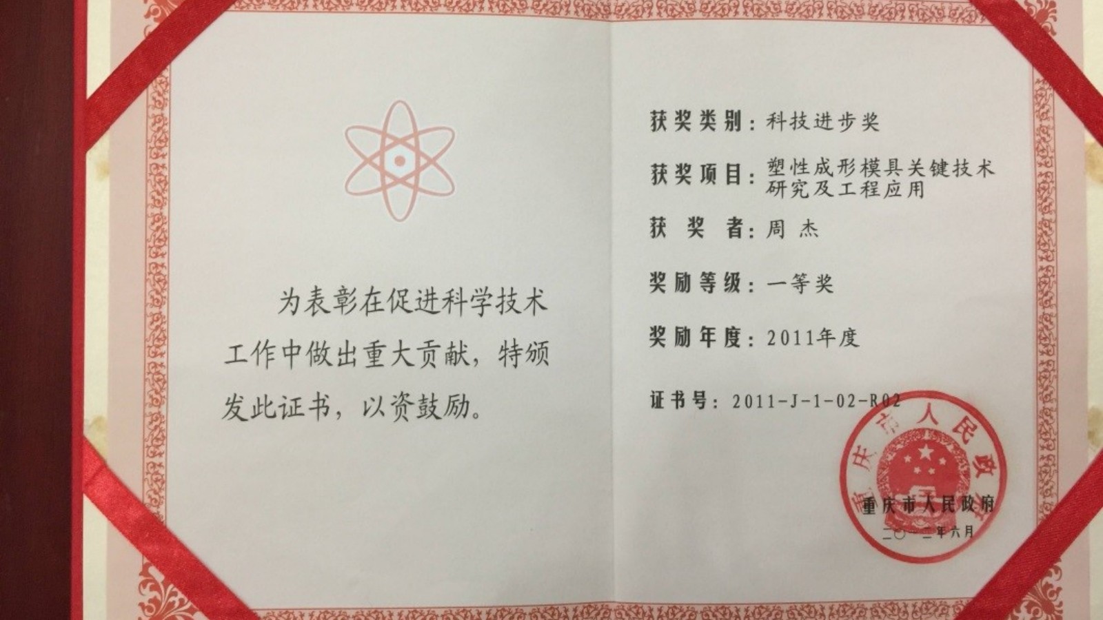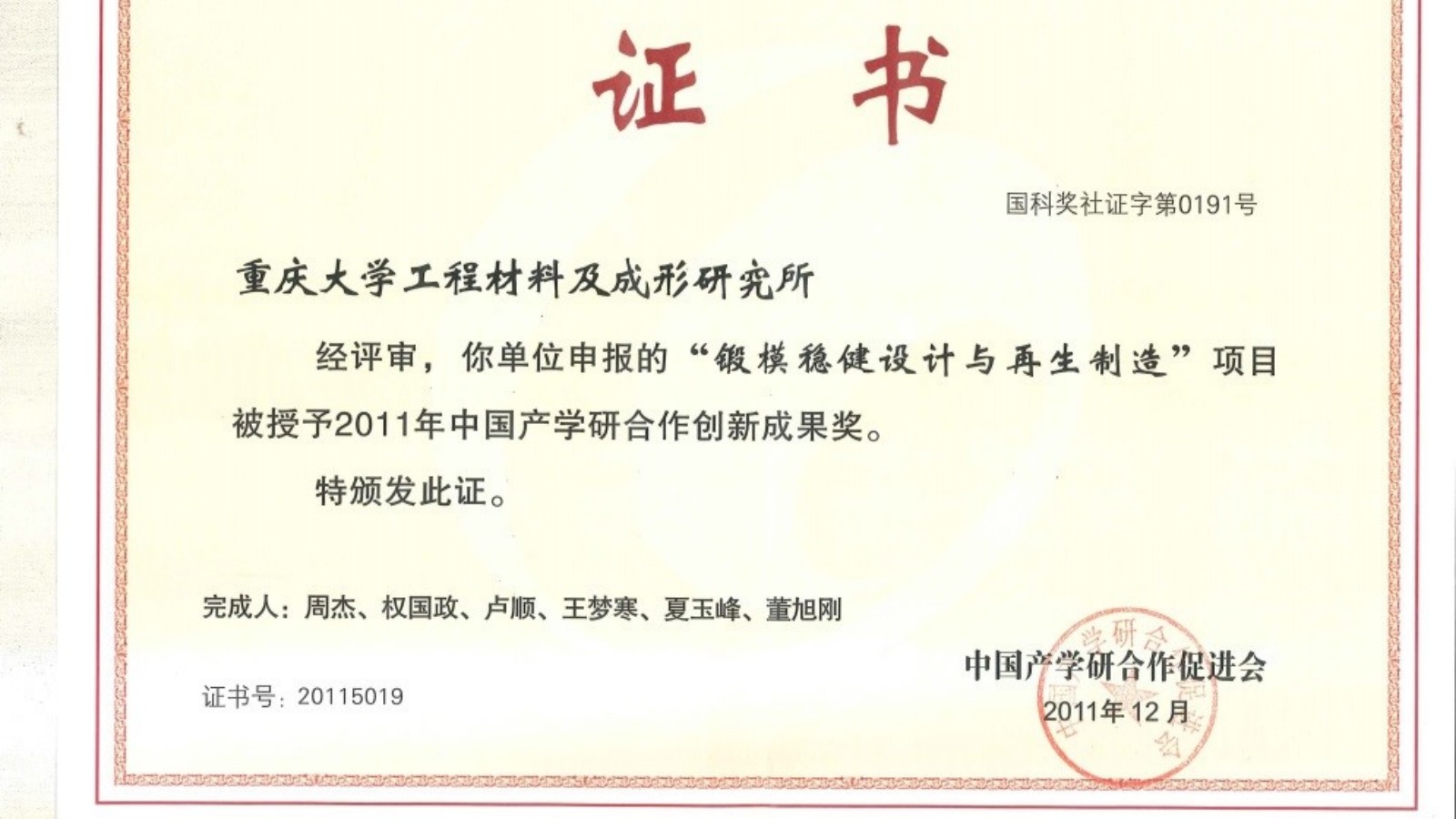 团队获得重庆市科技进步一等奖“塑性成形模具关键技术研究及工程应用”,中国锻压协会意见表明,双金属梯度层锻模再制造技术达到国际先进水平。该技术被中国锻压行业协会确定为“十二五”、“十三五”重点推广的先进工艺。