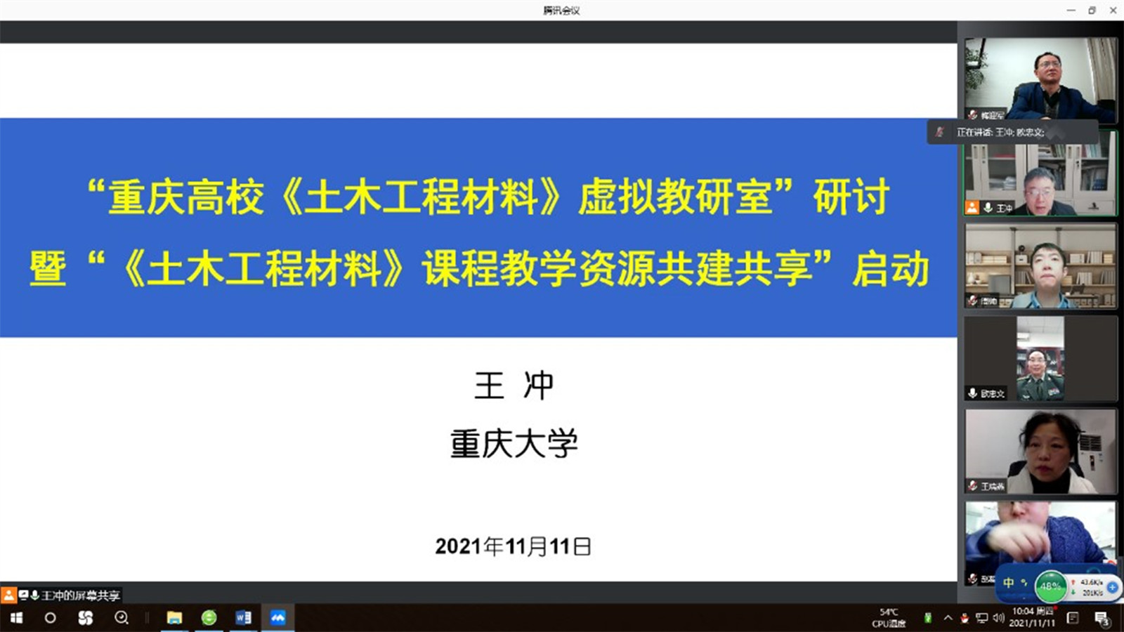 On November 11, 2021, in order to give full play to the advantages and specialties of universities in Chongqing, form horizontal synergy among peers, and create co-built and shared teaching resources, the discussion of Virtual Teaching and Research Room of Civil Engineering Materials of Universities in Chongqing and the launching meeting of Co-construction and Sharing of Teaching resources of Civil Engineering Materials was successfully held by online video meeting organized by the Building Materials Department of Chongqing University. The meeting was chaired by Professor Wang Chong of Chongqing University.