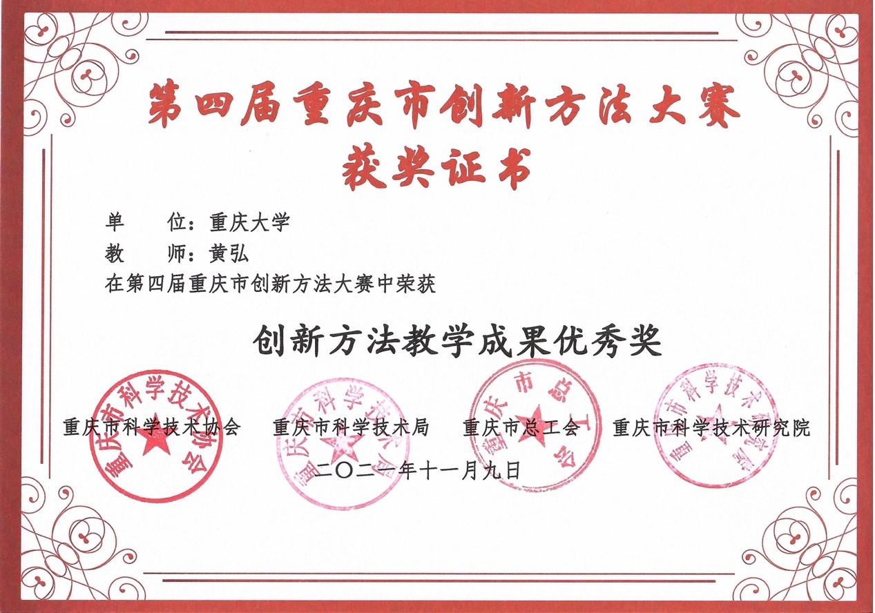 From October 30 to 31, 2021, Associate Prof Hong Huang, a young teacher of College of Materials Science and Engineering, won the award of Excellence in Innovative Method Teaching Achievement for his entry work Application of Six Sigma Experimental Design in Advanced Cement-based Materials in the 4th Chongqing Innovative Method Competition sponsored by Municipal Association for Science and Technology and Bureau of Science and Technology.