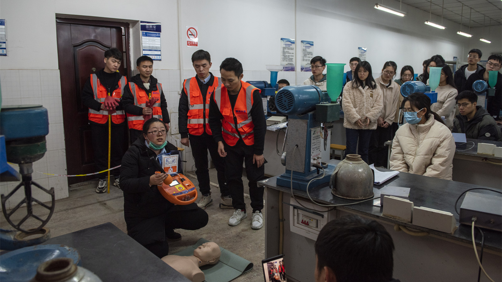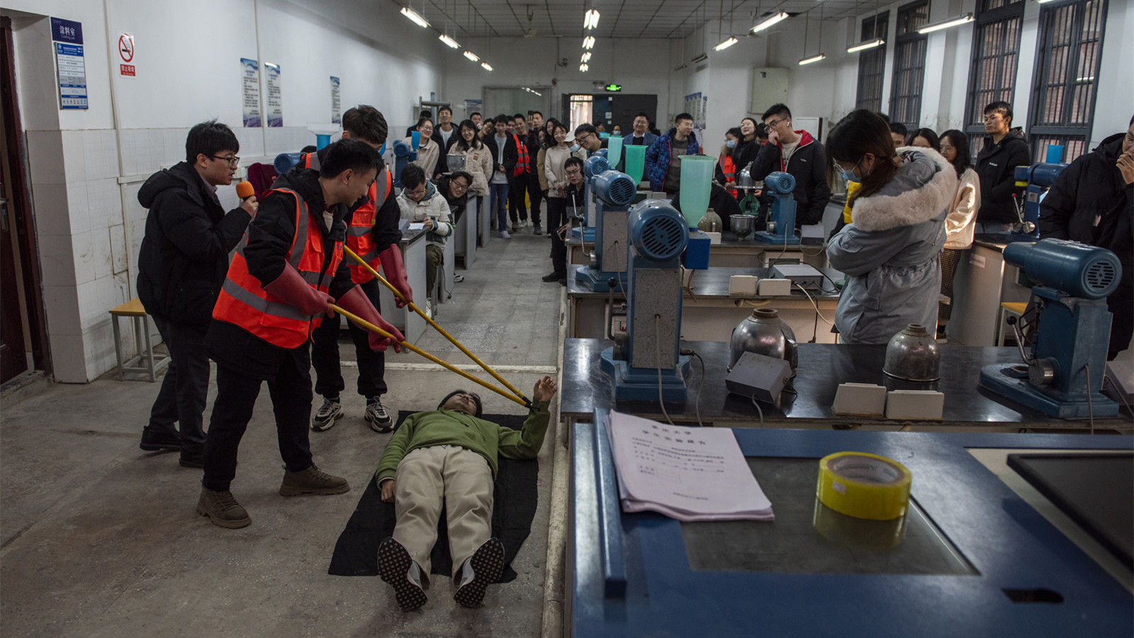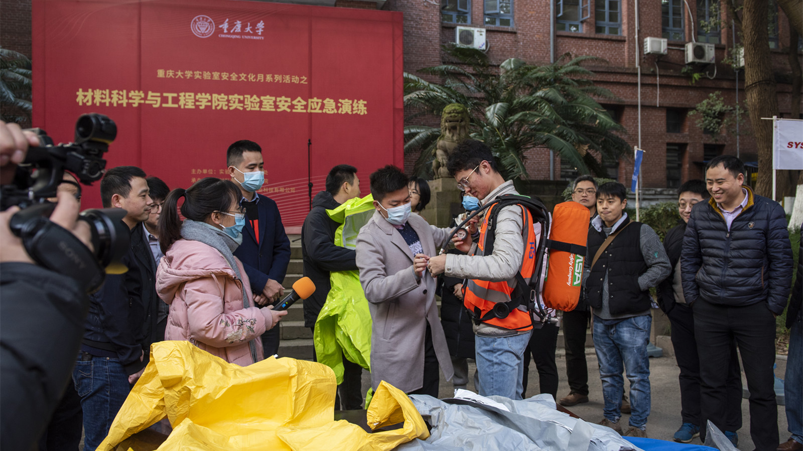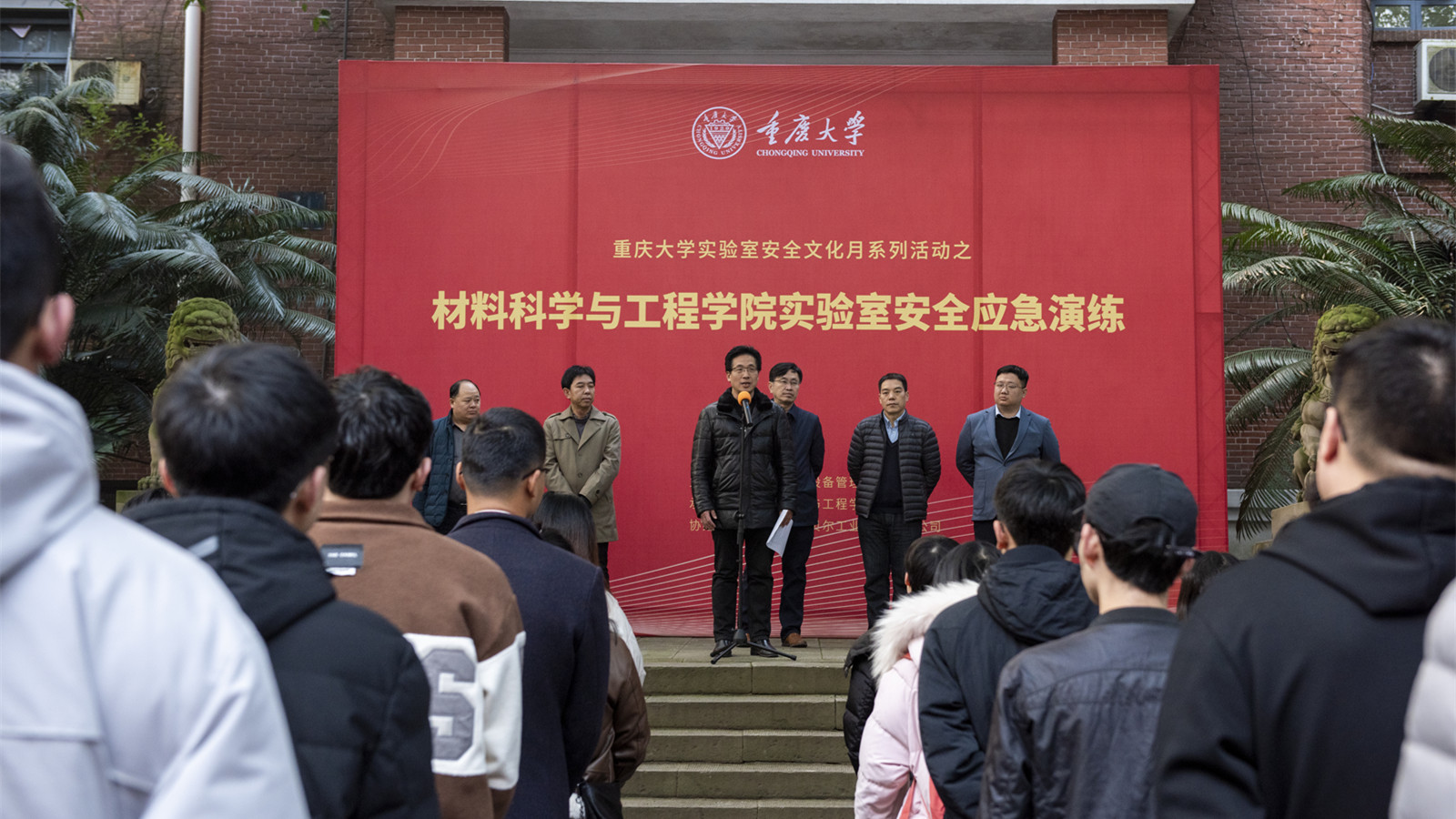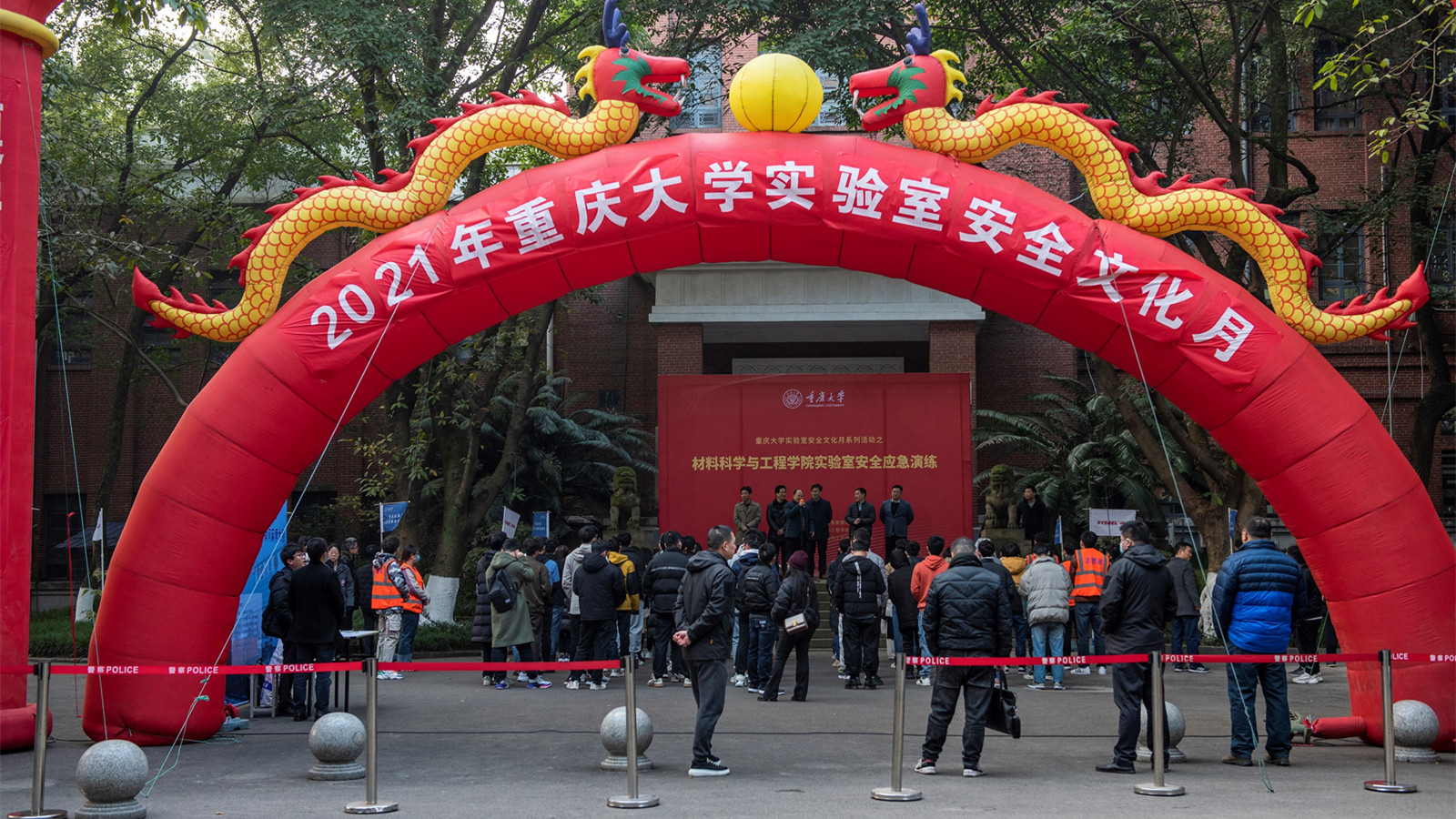 On December 21, 2021, in order to enhance the safety awareness of teachers and students and improve the emergency handling ability, and strengthen the self-rescue and rescue skills to deal with all kinds of laboratory safety accidents. a laboratory safety emergency drill was held in building Materials Experimental Building, Zone B of Chongqing University. This activity was an important activity of Chongqing University Laboratory Safety Culture Month. More than 350 teachers and students from the School of Materials Science and Engineering and related colleges participated in the activity. This activity was sponsored by Laboratory and Equipment Management Office of Chongqing University and undertaken by College of Materials Science and Engineering. Director Yunhuai Zhang of the Laboratory and Equipment Management Office, Deputy Director Changwu Yuan, Director Bing He of the Political Stability Office of the Security Department, Secretary of the Party Committee Jingfeng Wang of School of Materials Science and Engineering and Deputy Dean Zejun Chen and other leaders attended the launch ceremony of the security exercise held by Zejun Chen.