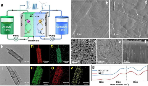 Vanadium redox flow battery is one of the most promising technologies for large-scale energy storage, which can be used both as an energy storage device for clean energy generation and as an auxiliary means for grid peaking to achieve safe and efficient grid operation. As one of the key materials of redox flow battery, ion exchange membrane determines the performance and cost of the battery; it isolates the positive and negative electrodes and electrolyte to prevent electrode contact short circuit and electrolyte cross contamination, while allows balanced ions to pass freely through the membrane to maintain the overall electrical neutrality of the battery. Currently, the low ion selectivity of the Nafion series of diaphragms, commonly used in vanadium redox flow batteries, has seriously affected the development of vanadium redox flow batteries. In response, the research team used electrochemical anodic oxidation to prepare TiO2 nanotubes and applied their superhydrophilicity to modulate the Nafion membrane structure, reduce the use of polymers and ultimately obtain high-performance ion-exchange membranes for vanadium redox flow battery. This technology significantly improves the ion-selective performance and reduces the cost of the diaphragm, which has a wide range of application prospects.
