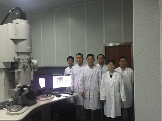 (Some members of Prof. Xiaoxu Huang's team and the world's first 3D transmission-electron microscope with both 3D crystal orientation reconstruction and 3D diffraction image reconstruction functions developed by the team)