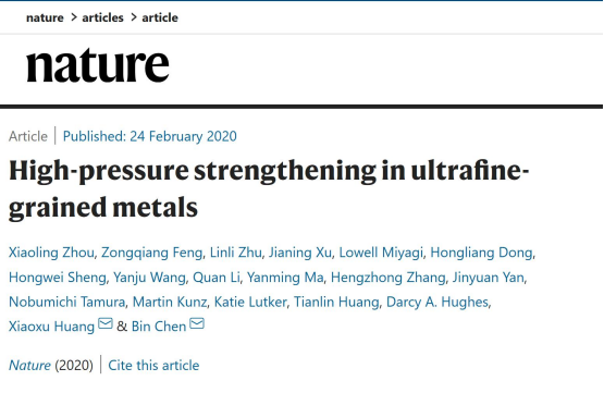 Recently, Prof. Xiaoxu Huang's team of our college and Bin Chen's team from Beijing High Pressure Research Center published a research paper entitled "High-pressure strengthening in ultrafine-grained metals" in Nature. Professor Xiaoxu Huang is the co-corresponding author, Chongqing University is the co-corresponding affiliation, our young faculty Zongqiang Feng is a co-first author, and Associate Professor Tianlin Huang is a co-author. This research result is another important progress of Chongqing University in the field of materials science, following the publication in Science as a corresponding affiliation in July 2019.