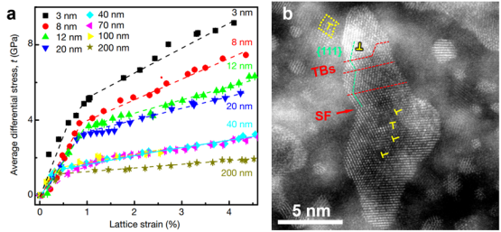 ((a) Continuous increase in strength of pure nickel samples with decreasing grain size under high-pressure deformation conditions; (b) high-resolution transmission electron microscopy images showing deformation microstructures, macroscopic morphologies and dislocation structure of pure nickel samples with a grain size of 3 nm.)